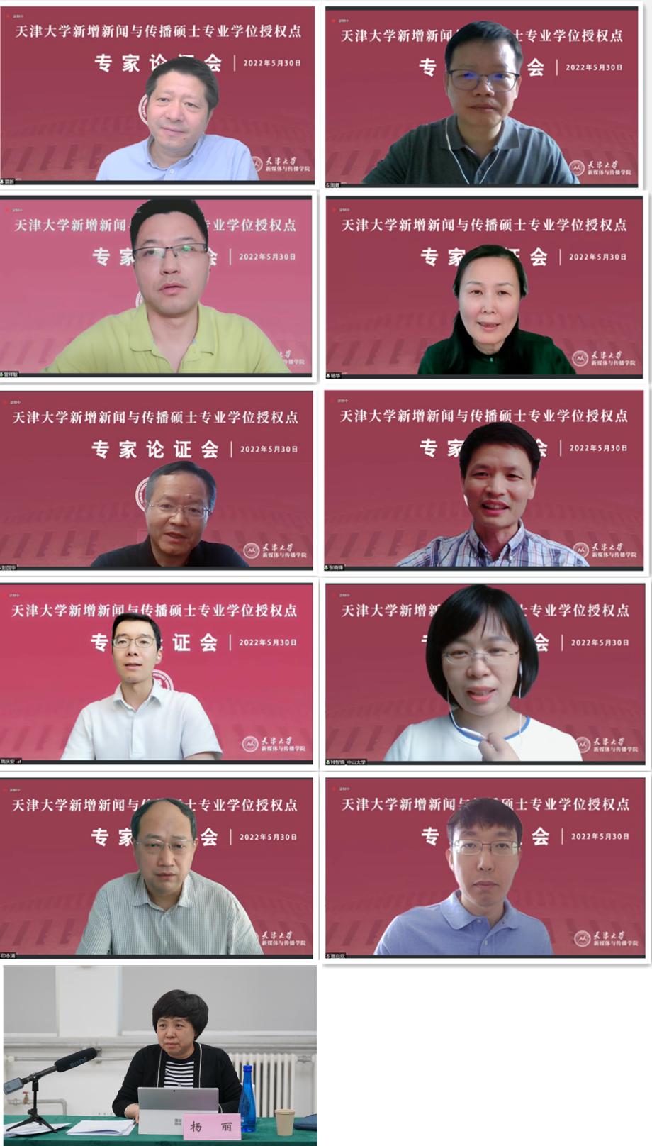论证会专家组由复旦大学党委常务副书记、全国新闻与传播专业学位研究生教育指导委员会副主任委员裘新教授担任组长。成员包括中国人民大学新闻学院院长、全国新闻与传播专业学位研究生教育指导委员会副主任委员周勇教授;中国传媒大学电视学院党委书记、全国新闻与传播专业学位研究生教育指导委员会副主任委员曾祥敏教授;中央广播电视总台创新发展研究中心召集人、全国新闻与传播专业学位研究生教育指导委员会委员杨华主任;人民日报理论部副主任、全国新闻与传播专业学位研究生教育指导委员会委员彭国华主任;南京师范大学新闻与传播学院院长、全国新闻与传播专业学位研究生教育指导委员会委员张晓锋教授;清华大学新闻与传播学院副院长、全国新闻与传播专业学位研究生教育指导委员会委员周庆安教授;中山大学传播与设计学院教授、全国新闻与传播专业学位研究生教育指导委员会委员钟智锦教授;天津海河传媒中心副总裁,天津广播电视事业部总编辑印永清总;天津市委宣传部新闻处贾自欣处长;天津大学应用心理研究所所长、心理健康教育中心主任杨丽教授。疫情防控常态化背景下,专家论证会采用线上线下相结合的形式开展。在会议开始前,与会嘉宾共同在线完成合影。