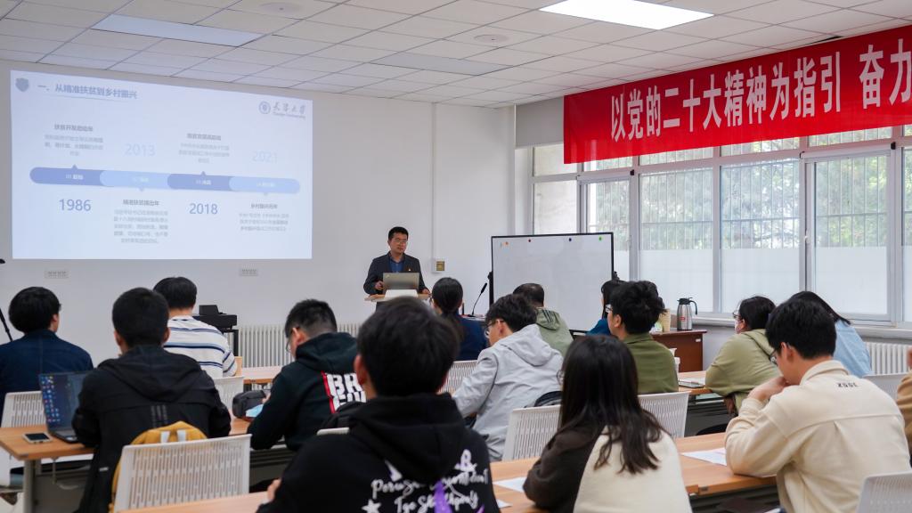 天津大学驻村干部、甘肃省宕昌县大寨村第一书记杨帆以《奔赴山海 青春无悔》为题目,与全体学生党员分享了两年多来他驻村工作的思考与体验。在谈驻村工作初心时,他用理想、感情、坚持、砺己四个词语勉励全体学生坚定理想信念,奋力做好科研创新,扎根中国式现代化一线,为全面建设社会主义现代化国家不懈奋斗。在谈工作方法与驻村工作感受时,他用深耕基层一线的工作案例,叮嘱学生要会讲故事、善讲故事,尤其作为新媒体学院研究生,更应练就讲好中国故事的本领,向国际社会传递中国声音、传播中国方案。