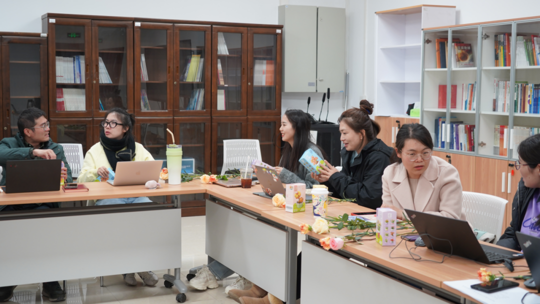 巾帼风采,花漾绽放。为进一步丰富学院精神文化生活, 提升学院凝聚力,在第114个国际妇女节即将来临之际,新媒体与传播学院以"芳华待灼 履践致远"为主题,开展庆祝"三八"妇女节的系列活动。3月5月下午,学院全体教师在18楼132会议室参与此次的创意花卉制作活动,为女性教师们送上节日祝福,并以此为契机营造学院“聚”文化。