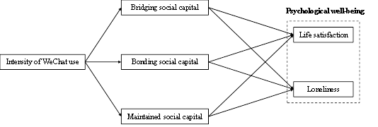 1. 社会化媒体和社会资本方面。社会资本作为嵌入一种社会结构中在有目的的行动中获取或动员的资源,它主要包括链合型社会资本,紧密型社会资本,维持型社会资本。如下图模型所示,研究关注微信的使用行为对于海外留学生群体三种不同维度的社会资本的影响。 此外,微信的使用行为对于这个群体的心理健康尤其是生活满意度和孤独感的影响。并且进一步探索了不同维度的社会资本在微信使用和心理因素中的中介效果。