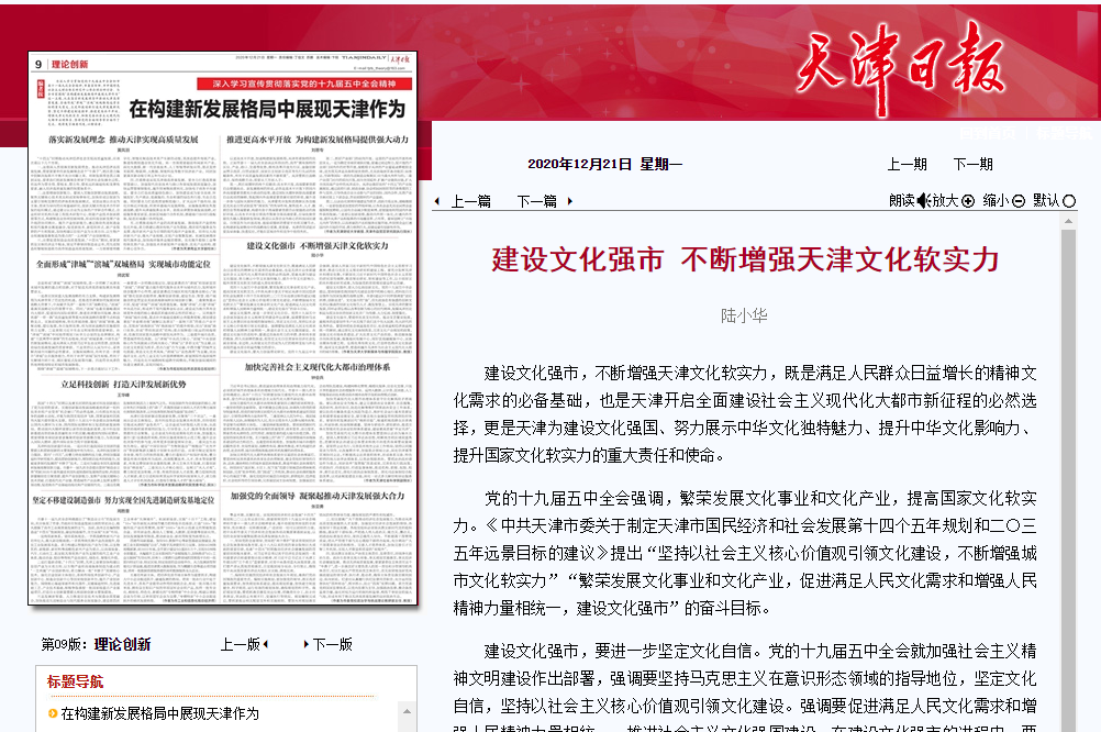 天津日报:陆小华:建设文化强市 不断增强天津文化软实力